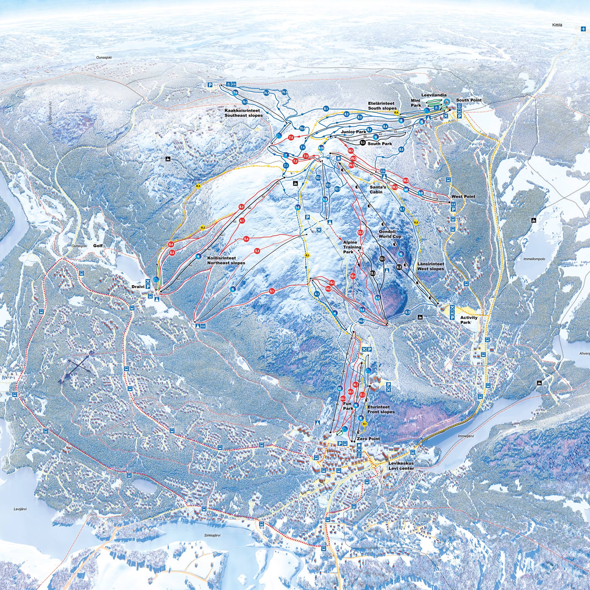 Le plan des pistes représente très bien le domaine skiable de Levi. Toutes les pistes et remontées mécaniques sont clairement identifiées par des numéros. Vous trouverez également au verso les horaires d’ouverture des installations, les horaires des skibus et d’autres informations. Le plan des pistes est en outre au format de poche pratique. Des indications d’altitude seraient encore souhaitables.