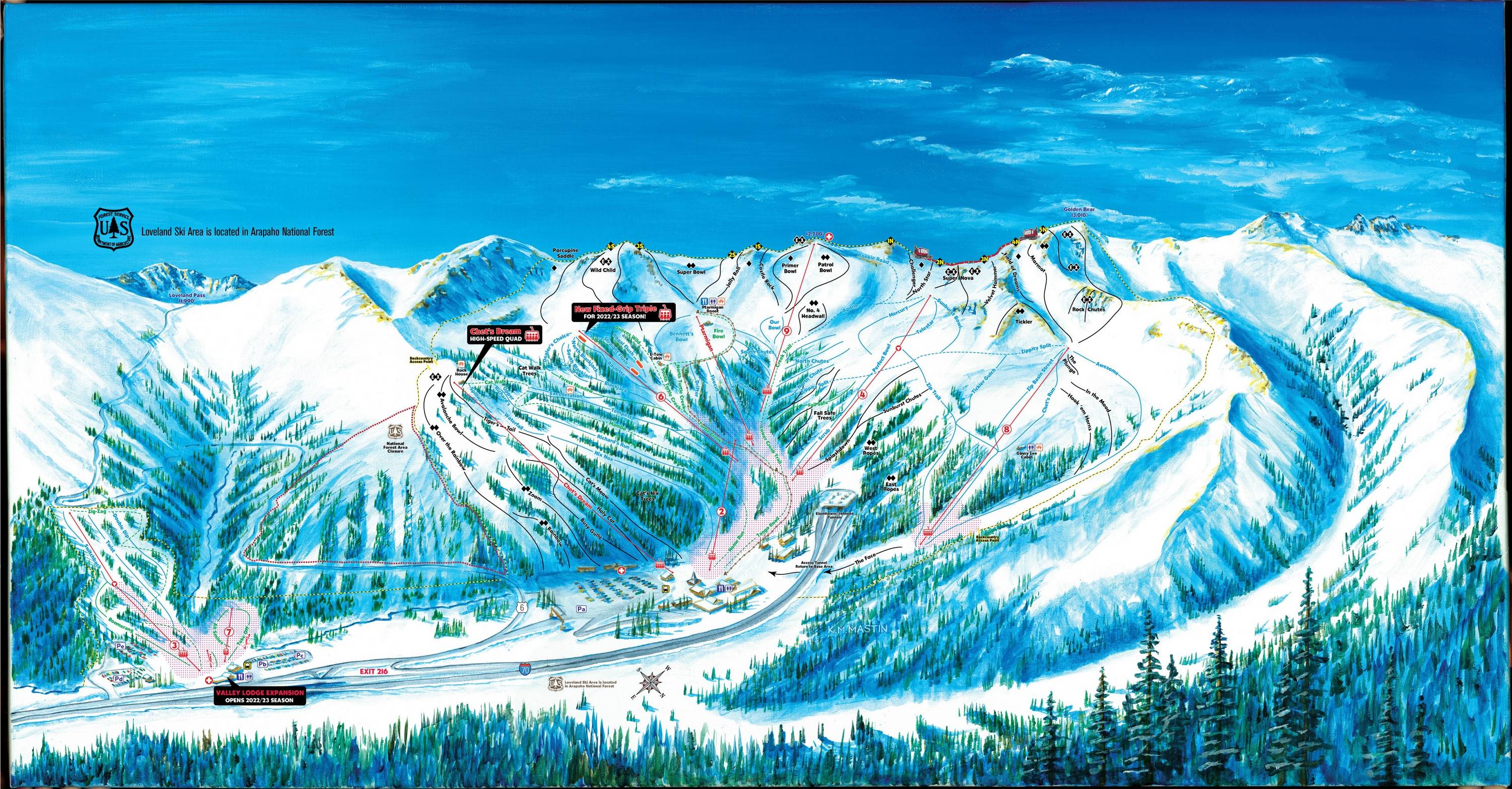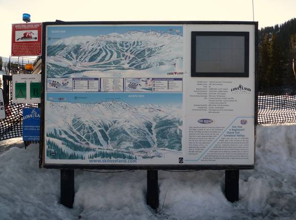 Indications de directions (plans, panneaux informatifs, signalisation) et sécurité sur le domaine skiable Loveland