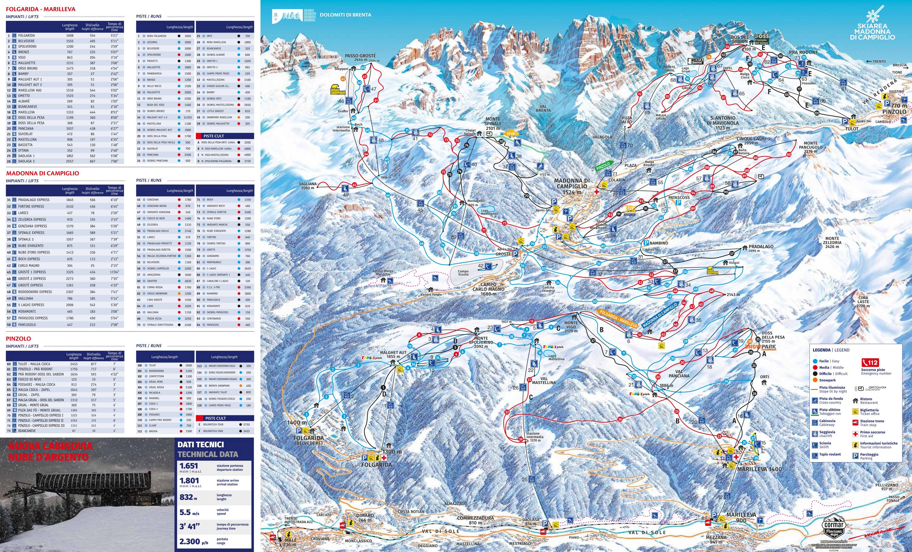 Le plan des pistes représente très bien l'ensemble du domaine skiable Campiglio Dolomiti di Brenta (Folgàrida/Marilléva/Madonna di Campiglio/Pinzolo). Toutes les remontées mécaniques et les pistes sont décrites en détail. Les snowparks, les refuges et d'autres informations sont présentés de manière exemplaire.