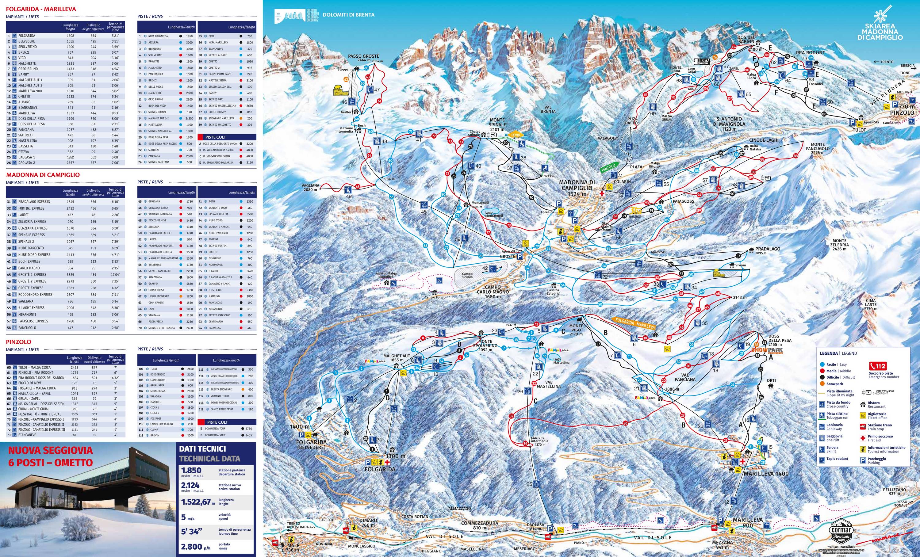 Le plan des pistes représente très bien l'ensemble du domaine skiable Campiglio Dolomiti di Brenta (Folgàrida/Marilléva/Madonna di Campiglio/Pinzolo). Toutes les remontées mécaniques et les pistes sont décrites en détail. Les snowparks, les refuges et d'autres informations sont présentés de manière exemplaire.