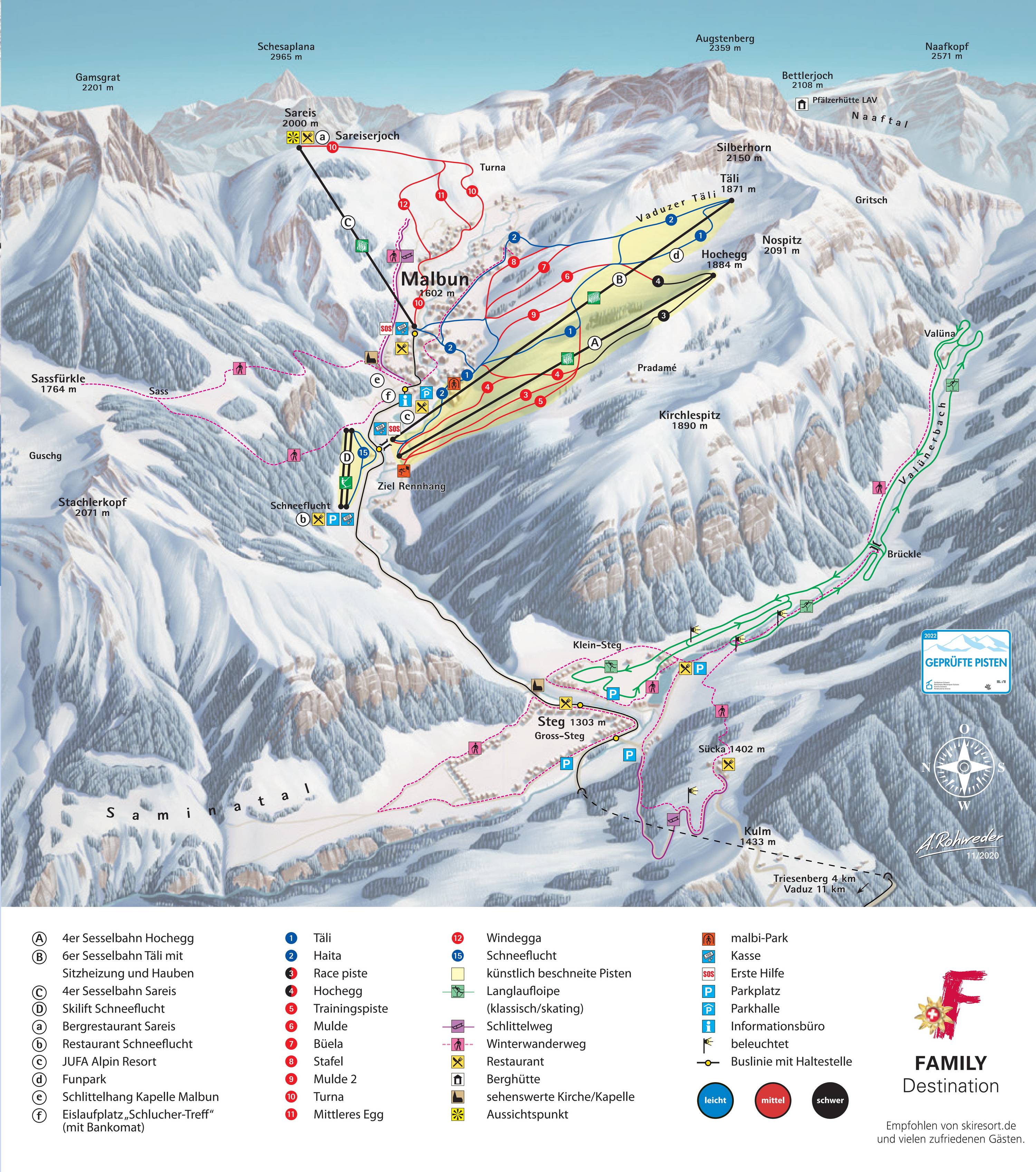 Malbun (0 km), Steg (1,9 km), Triesenberg (7 km), Vaduz (13 km) Communes près du domaine skiable