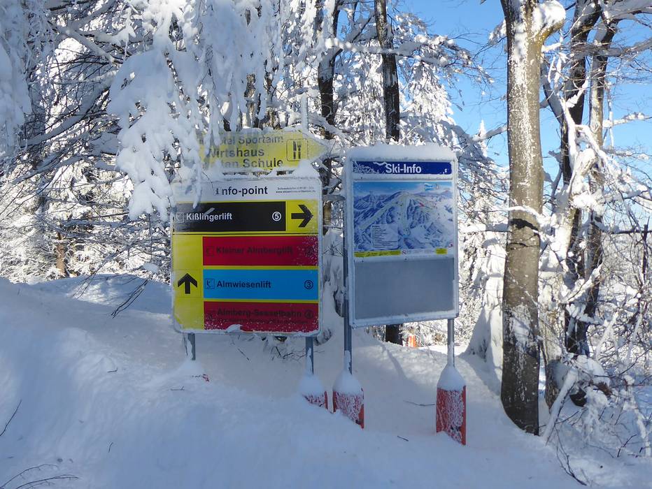 Indications de directions (plans, panneaux informatifs, signalisation) et sécurité sur le domaine skiable Mitterdorf – Almberg