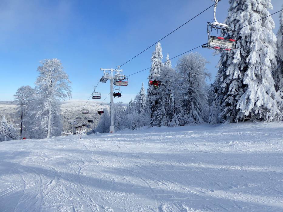 Avec le nouveau télésiège quatre places vers… Vue depuis l'Almberg sur la Forêt… Panorama dans le domaine skiable de Mitterdorf -…