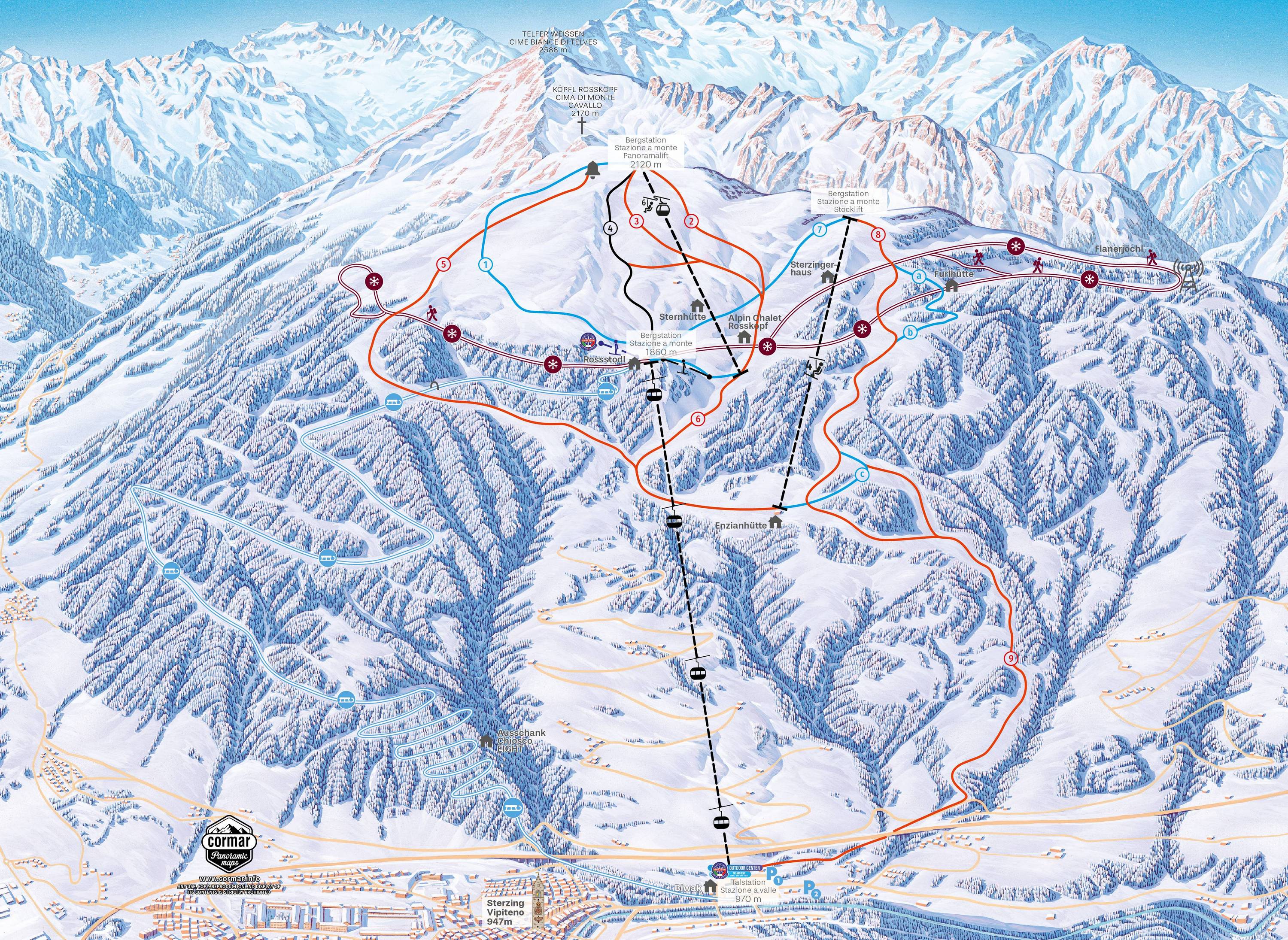 À la station de la vallée et à la station supérieure de la télécabine Rosskopf, on trouve des panneaux numériques et des informations sur la météo et le domaine skiable. Aux intersections des pistes, une signalisation uniforme est installée. Ainsi, il est très facile de s’orienter sur la montagne locale de Sterzing, le Rosskopf.