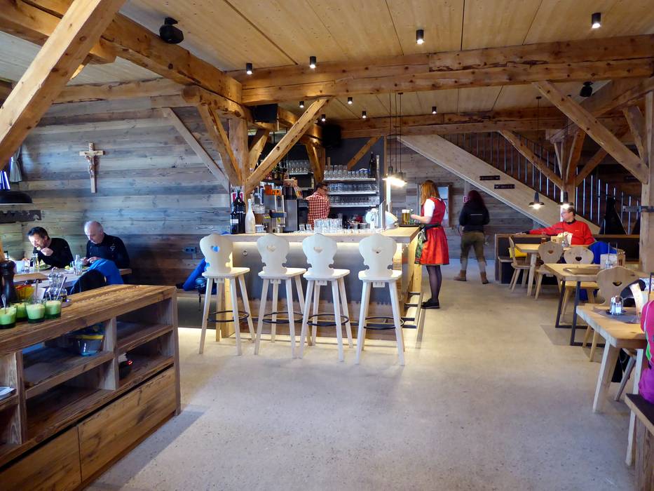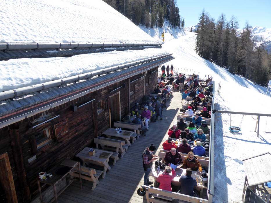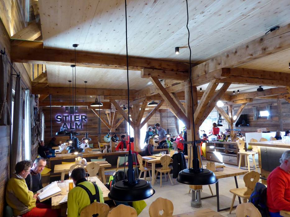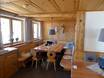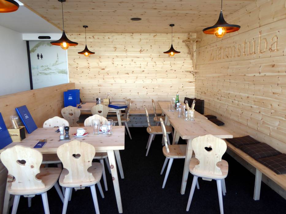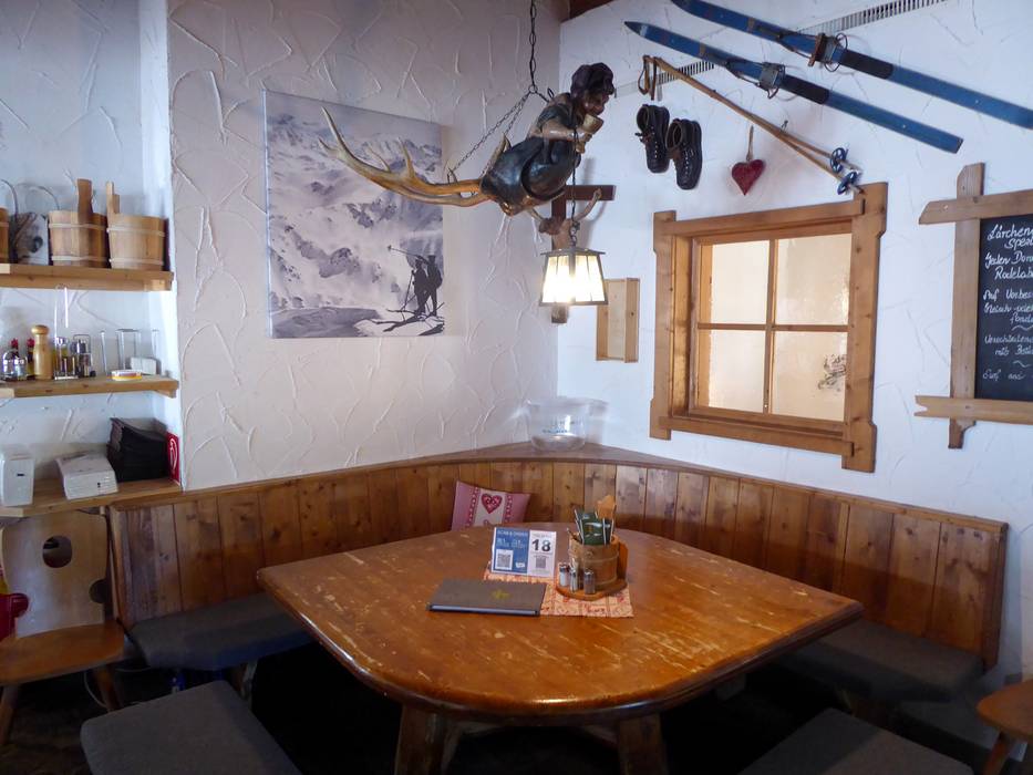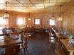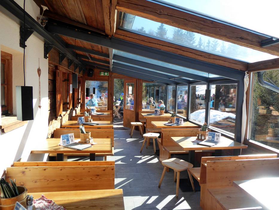 Malgré la reconstruction, le caractère rustique et traditionnel de la cabane a été préservé. Le restaurant avec service dispose de deux étages ainsi que d'une grande terrasse ensoleillée. Le Zirbenstüberl confortable offre un lieu de retraite. L'ambiance unique invite non seulement à une courte pause déjeuner. Il est également possible d'enlever ses chaussures de ski et de se détendre en chaussons. Une salle dédiée avec chauffe-chaussures de ski est à disposition à cet effet.