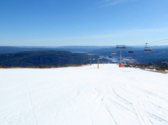 Piste Kryllingen avec vue sur le lac Krøderen Domaine skiable de Norefjell avec vue sur le lac…