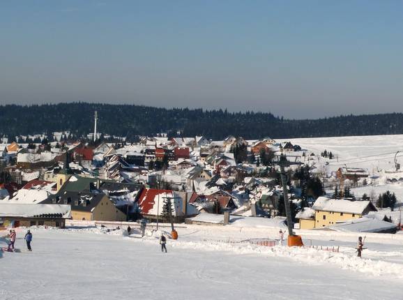 Depuis certains hébergements, il est possible d’accéder presque directement aux pistes depuis le village de Boží Dar. En général, il faut toutefois toujours marcher un peu à travers le village pour rejoindre les pistes.