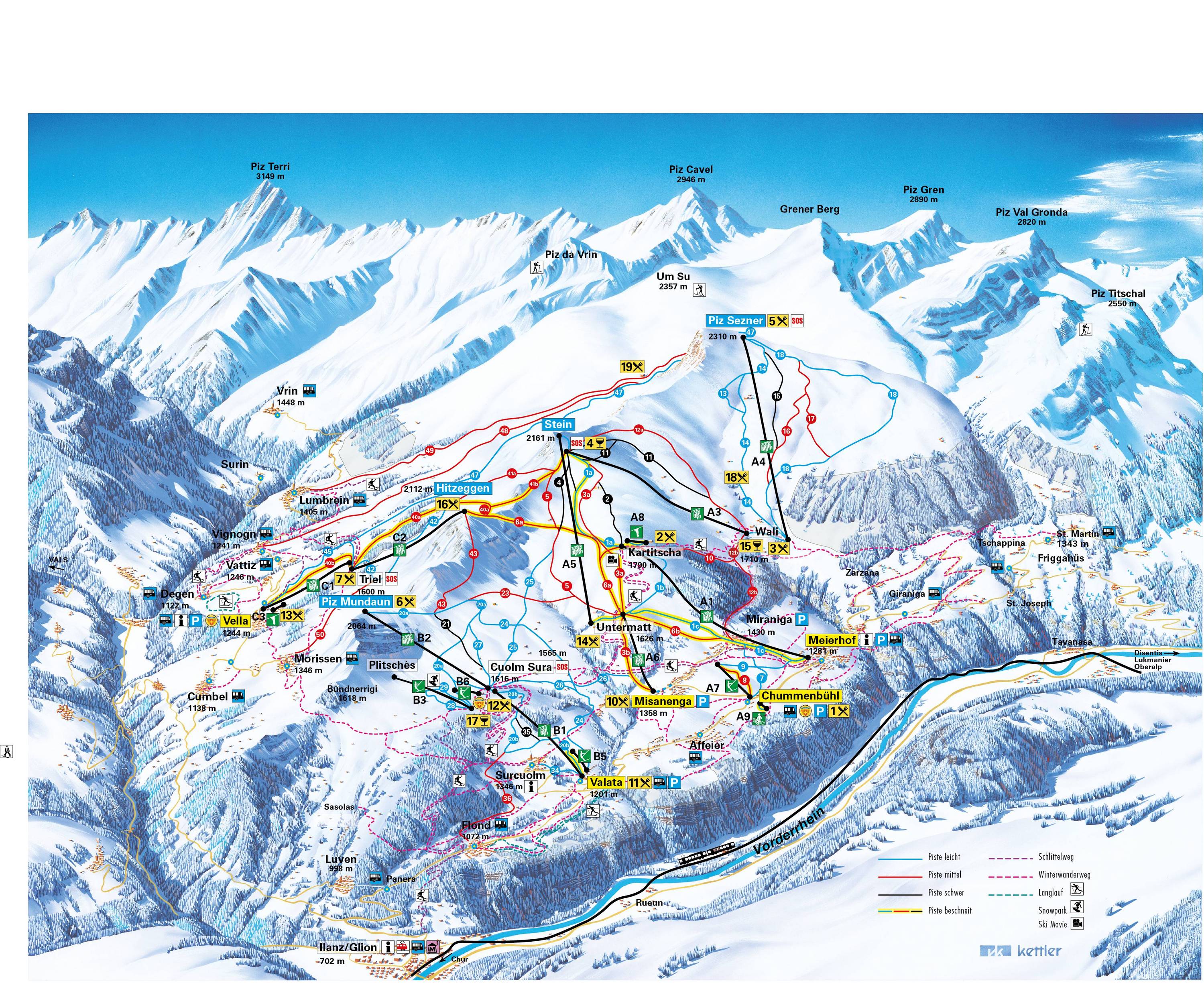 Indications de directions (plans, panneaux informatifs, signalisation) et sécurité sur le domaine skiable Obersaxen/Mundaun/Val Lumnezia