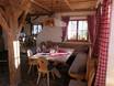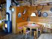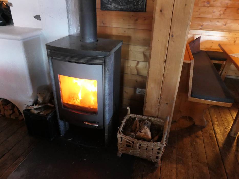 Petit chalet convivial avec quelques places assises à l'intérieur près du poêle et une grande terrasse.