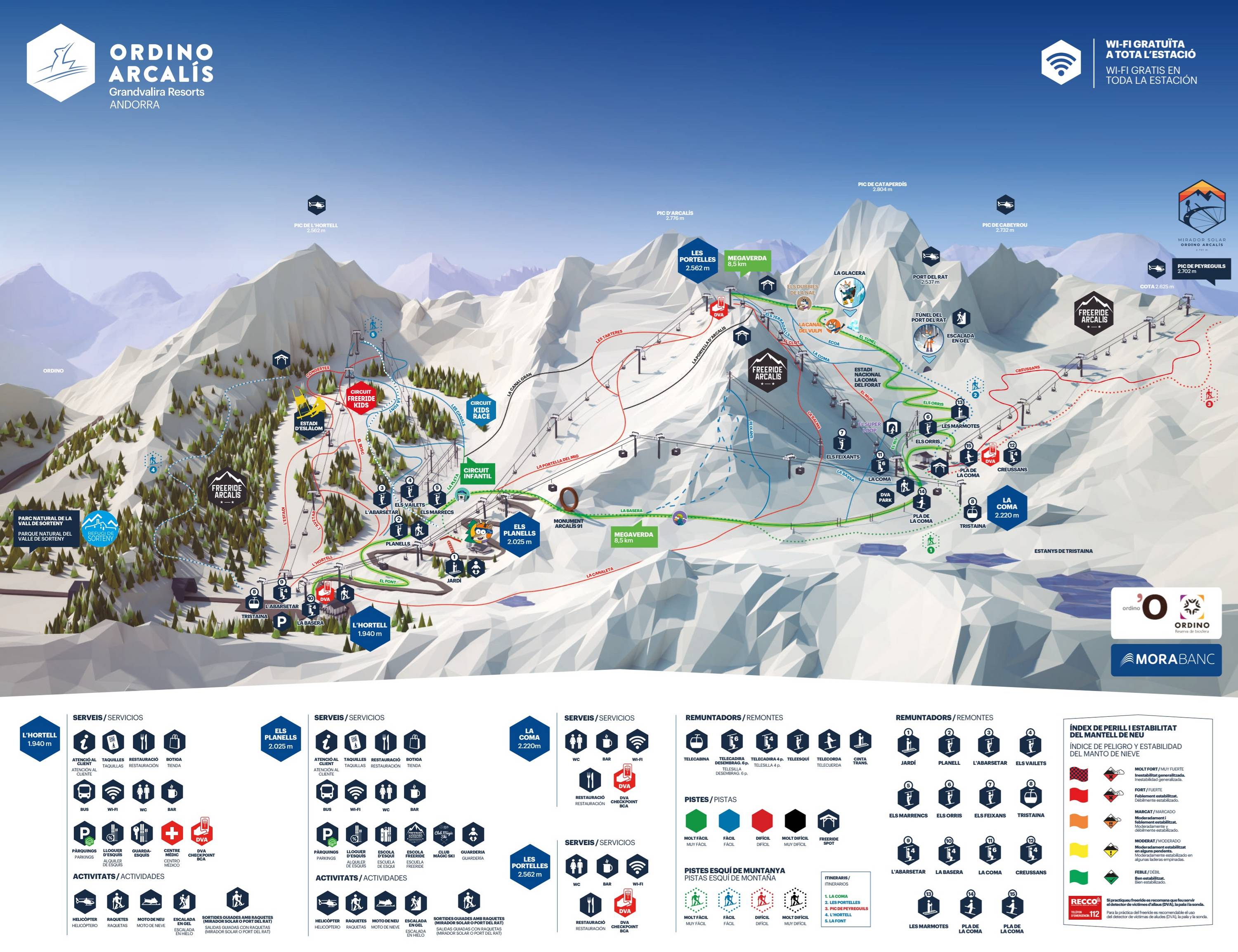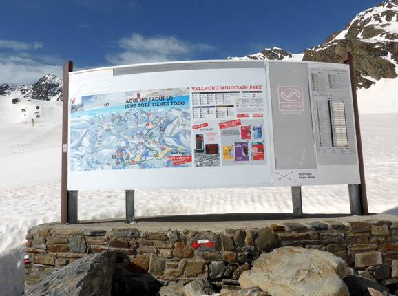 Le plan des pistes représente bien les deux domaines skiables Arcalís et Pal-Arinsal (Vallnord). Il est disponible en plusieurs langues pour les visiteurs internationaux. Les remontées mécaniques et les pistes sont indiquées par leur nom.