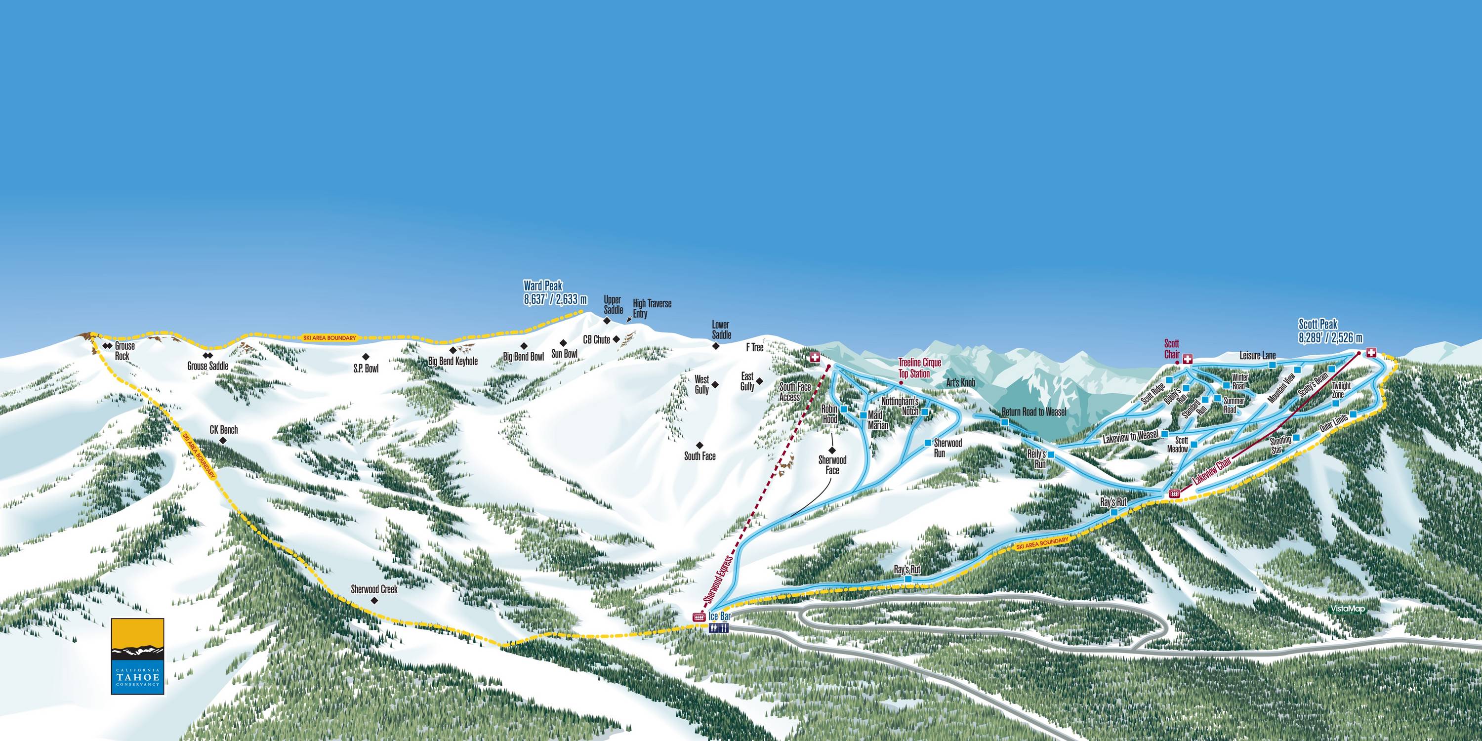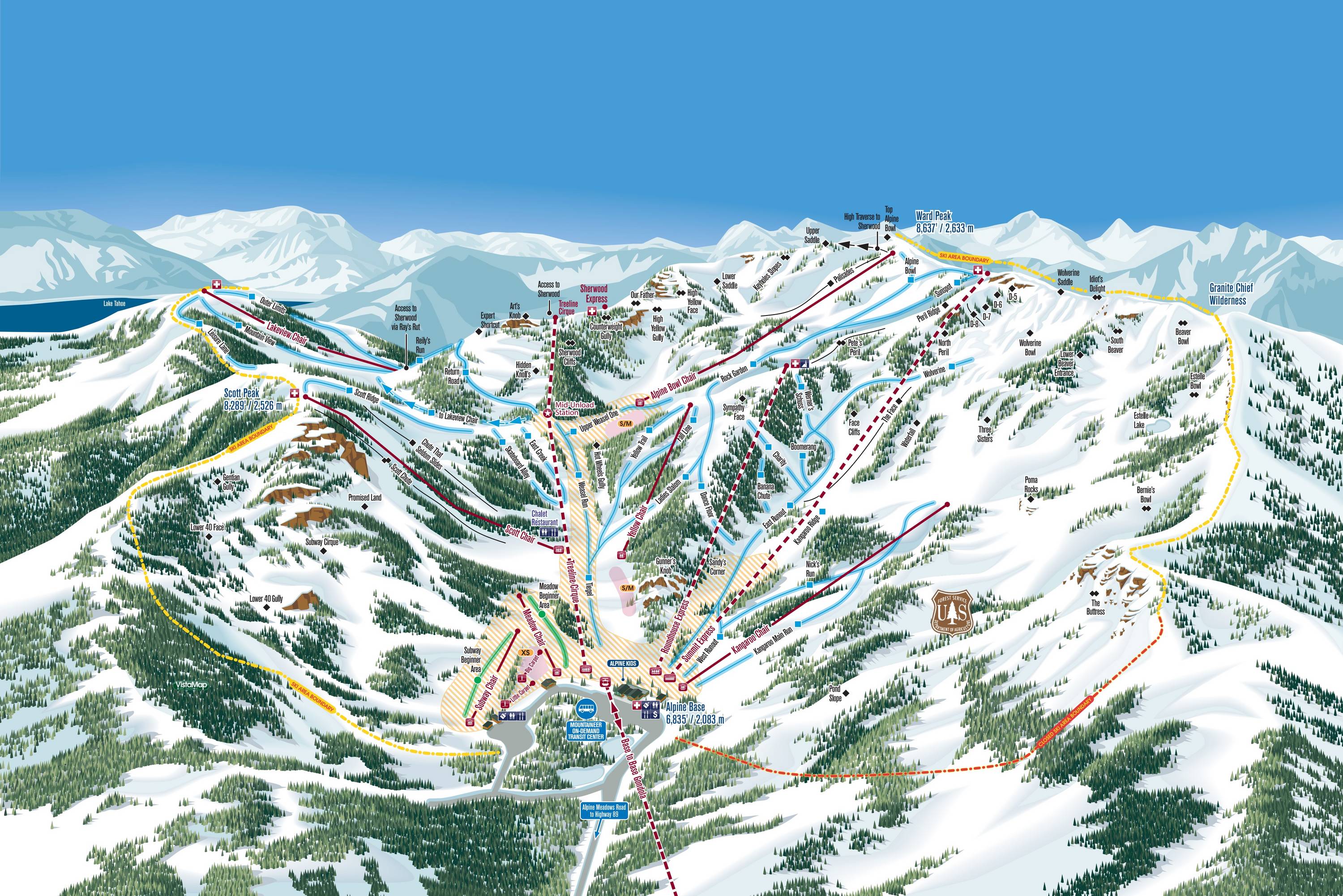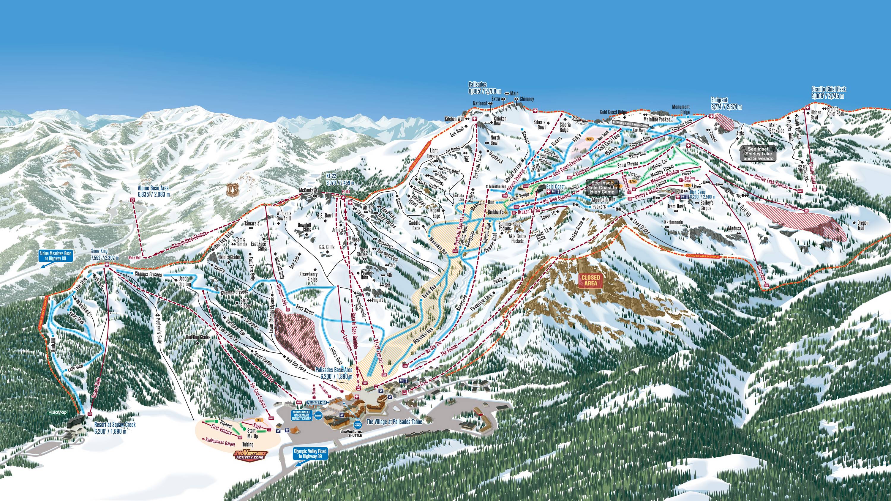 Le plan des pistes représente très bien le domaine skiable de Palisades Tahoe. Les remontées mécaniques et les téléphériques sont tous bien indiqués, mais malheureusement, toutes les descentes ne sont pas détaillées. En général, on a cependant une très bonne vue d'ensemble sur l'ensemble du domaine skiable.