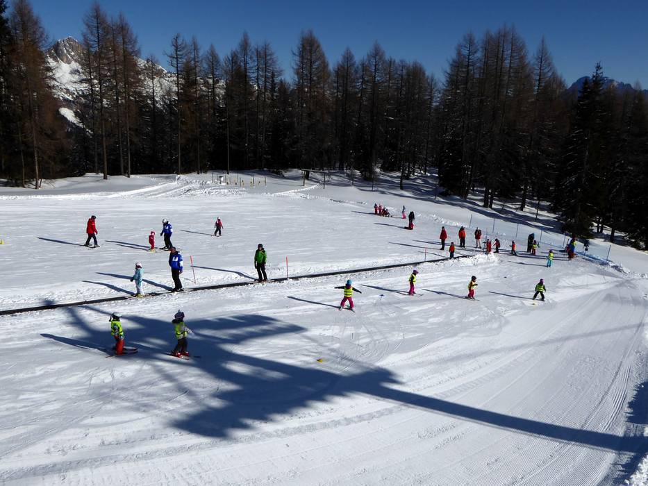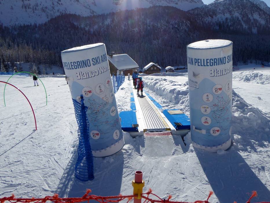 L'école de ski "Scuola italiana Sci e Snowboard Moena Dolomiti" gère le grand jardin des neiges au Passo San Pellegrino. Deux tapis roulants et des personnages amusants rendent l'apprentissage du ski facile comme un jeu d'enfant.