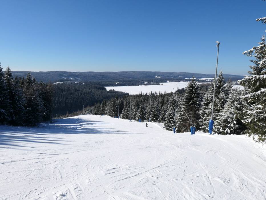 Depuis le point culminant du Pleßberg (Plešivec), descente par des pistes bleues jusqu'à la station de vallée à Pstruží.