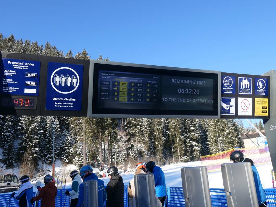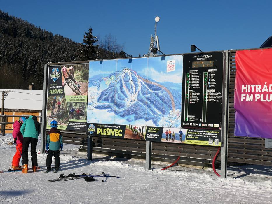 Indications de directions (plans, panneaux informatifs, signalisation) et sécurité sur le domaine skiable Plešivec – Abertamy