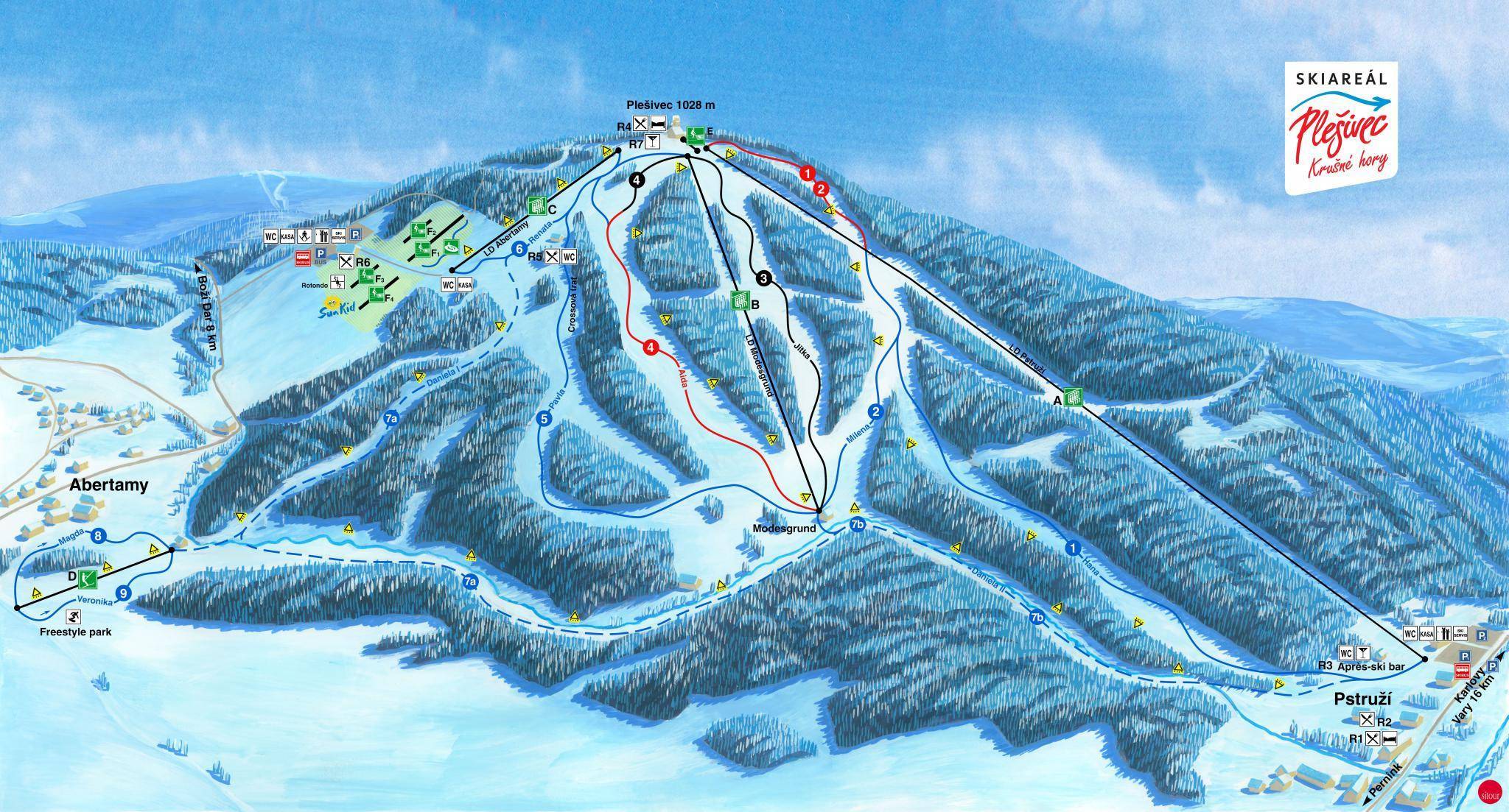 Le plan des pistes représente globalement très bien le domaine skiable. Le téléski directement à Abertamy est hors service.