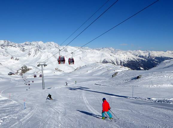 Panorama à 3 000 m au Passo Presena Descentes à travers les clairières forestières… Un télésiège quadriplace typique dans le domaine… Panorama à 3 000 m au Passo Presena