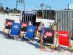 Ceux qui s’attardent ici devront remonter un peu ensuite, car le bar à parasols se trouve en plein milieu de la piste, un peu en contrebas des stations d’arrivée. Par temps ensoleillé, des chaises longues sont installées.