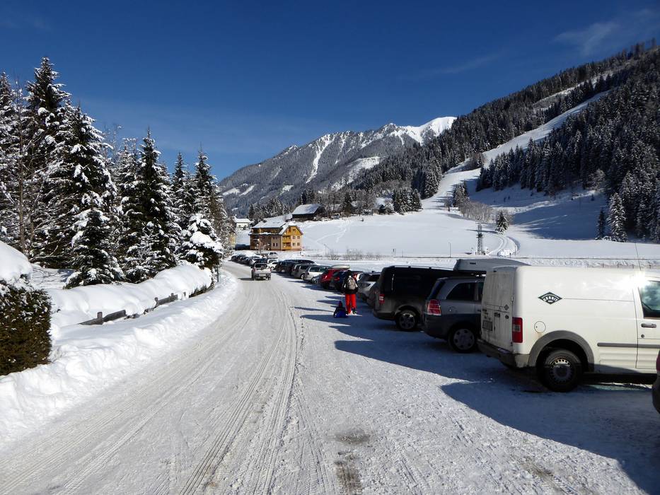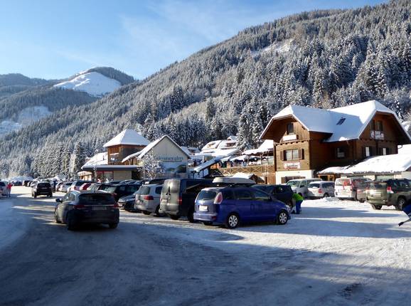 Le domaine skiable de Riesneralm se situe dans la région de vacances Schladming-Dachstein, dans le district de Liezen en Styrie. L’accès se fait généralement par l’autoroute A9 Pyhrn (est) ou l’autoroute A10 Tauern (ouest), puis par la vallée de l’Enns sur la B320 jusqu’au carrefour de Trautenfels. Depuis Trautenfels, la route de montagne B75 (Glattjoch Straße), très bien aménagée, mène à Donnersbachwald en passant par les villages d’Irdning et Donnersbach. Un déneigement optimal facilite l’arrivée en voiture ou en bus. Les parkings gratuits se trouvent directement à la station inférieure de la Riesnerbahn, sur une surface plane et spacieuse, permettant de commencer la journée de ski sans stress et sans gardien de parking. D’autres places de stationnement sont également disponibles directement à la Kinderskischaukel.