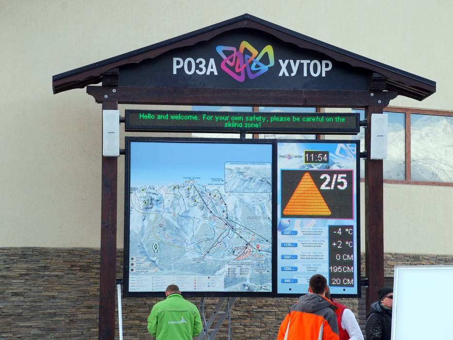 De grands panneaux d'information avec affichage électronique des remontées mécaniques et des pistes ouvertes se trouvent aux points stratégiques du domaine skiable. La signalisation des pistes pourrait être améliorée. Point positif : tous les panneaux sont indiqués en russe (alphabet cyrillique) et en anglais.