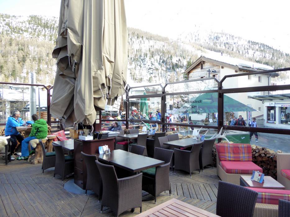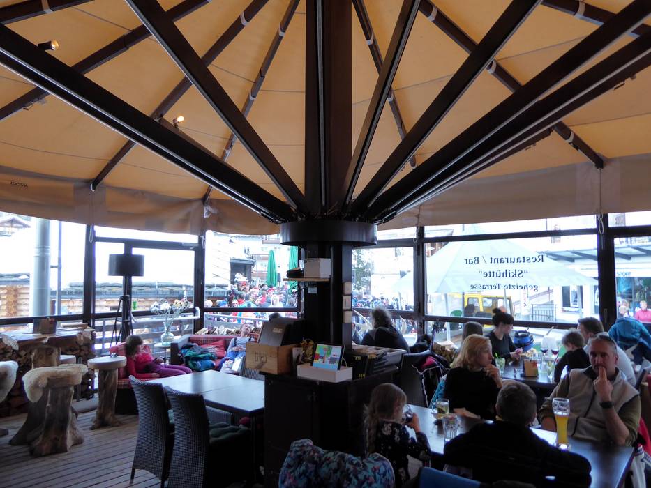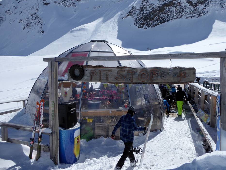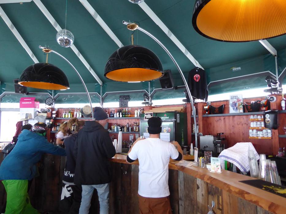 Dans la « Skihütte », on termine la journée de ski en toute tranquillité. On peut déguster un verre de vin accompagné de finger food et de spécialités fromagères. Le bar lounge invite à la détente. Sous le grand parasol, on peut confortablement observer l’animation de la Gletscherstraße.