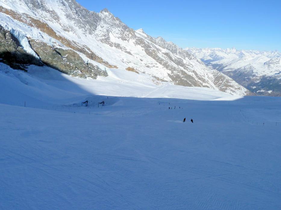 Le domaine skiable de Saas-Fee propose des descentes de tous niveaux de difficulté. La plupart des pistes se trouvent au-dessus de la limite des arbres et sont généralement très larges. Les descentes sur glacier du Feegletscher sont assez raides dans la partie supérieure, puis deviennent de plus en plus plates. Autour de la station Morenia, on trouve de nombreuses pistes de difficulté moyenne desservies par le télésiège six places. Les pistes du Längfluh via Spielboden jusqu’à Saas-Fee sont particulièrement impressionnantes. Ici, on longe d’immenses glaciers et on traverse ensuite un terrain très rocheux. Au Plattjen, on trouve des pistes assez exigeantes. Les pistes dans la partie inférieure traversent des clairières forestières jusqu’à Saas-Fee. Dans la vallée, de larges pistes faciles attendent les débutants.