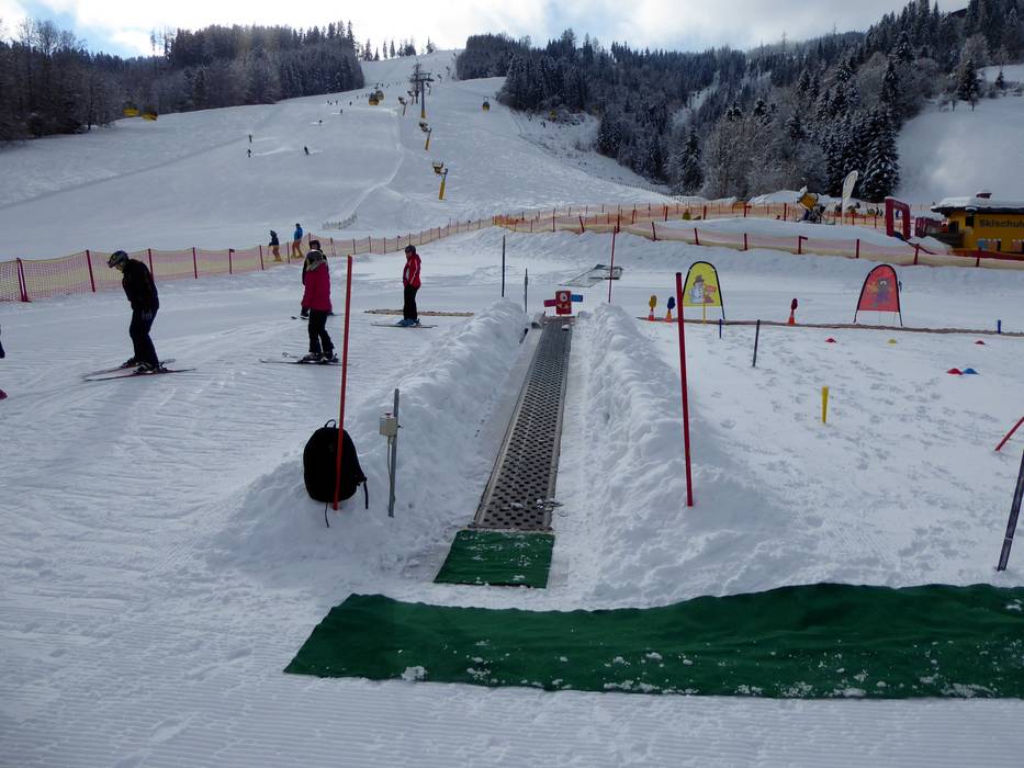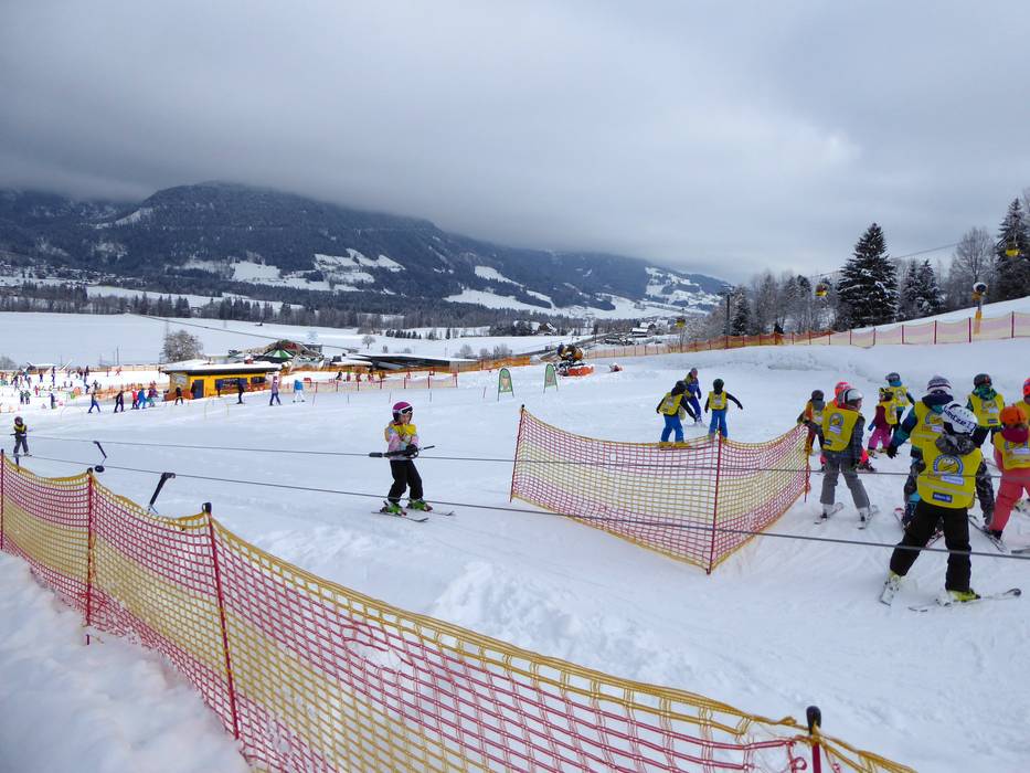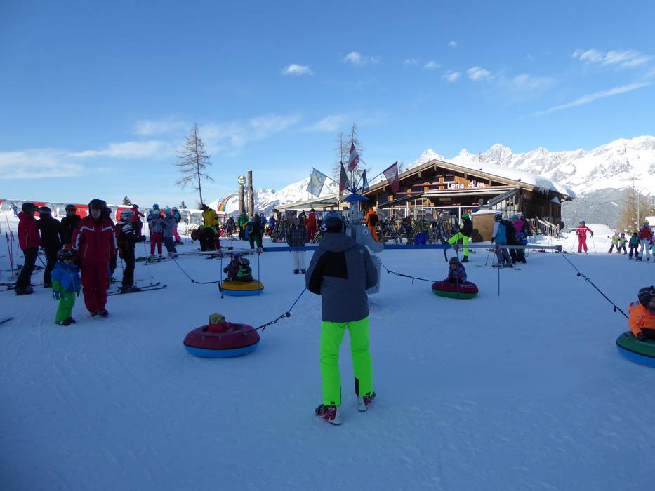 À la remontée Hopsilift à Rohrmoos, l'école de ski Hopl gère un jardin d'enfants avec un tapis roulant. Une fois les premières glissades réussies, les enfants peuvent continuer à s'entraîner directement au téléski voisin.