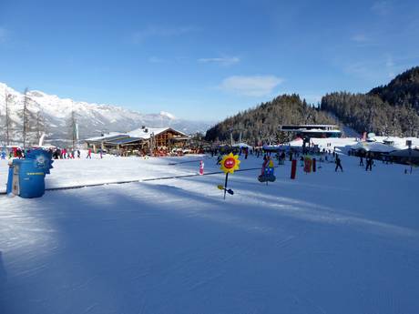 Directement à la station de vallée du Hauser Kaiblingbahn se trouve un espace enfants bien équipé. Un téléski à corde et des tapis roulants emmènent les petits vers le haut. Le parcours à travers des personnages amusants et des piquets de slalom amuse beaucoup les enfants. Un carrousel pour enfants complète l’offre.