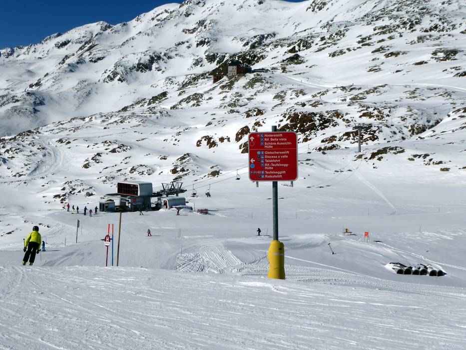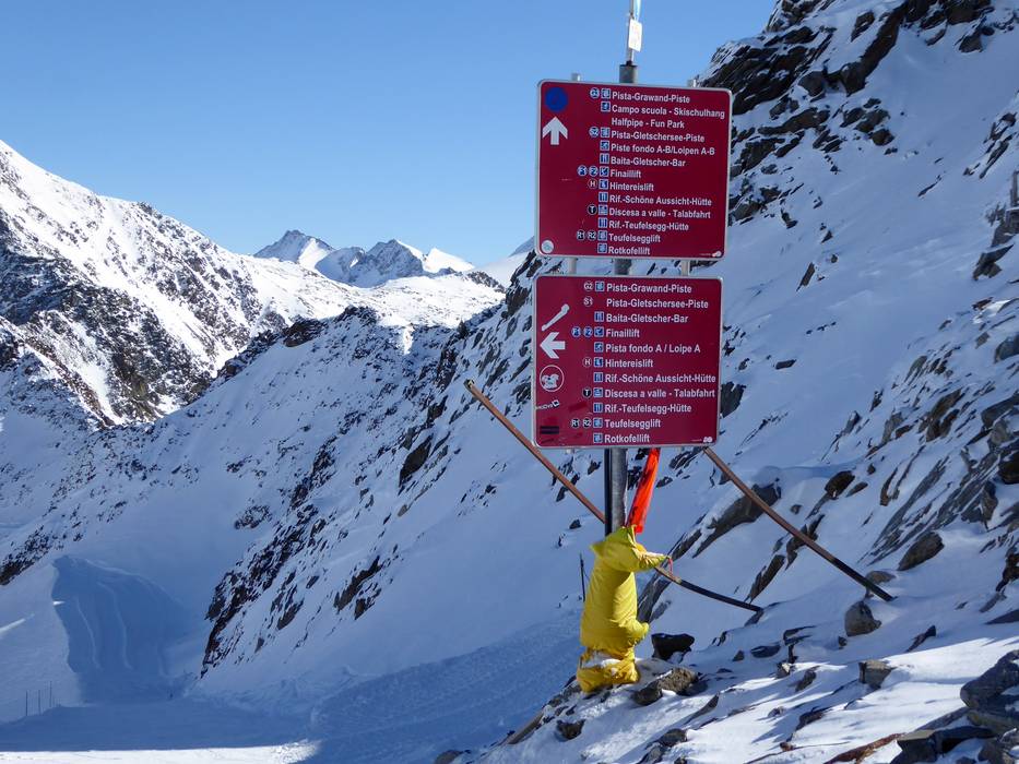 Indications de directions (plans, panneaux informatifs, signalisation) et sécurité sur le domaine skiable Schnalstaler Gletscher (Glacier du Val Senales)