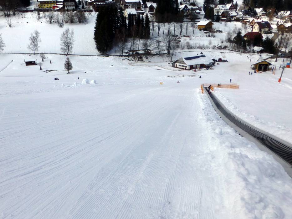 La piste principale est de difficulté moyenne, tandis que la piste familiale, grâce à sa largeur et à sa pente modérée, convient très bien aux débutants et aux enfants. L’itinéraire de ski n’est accessible qu’après une courte marche à pied (environ 5 minutes) et traverse la forêt pour revenir à la station de la vallée. Le tapis roulant se trouve sur un terrain plat.