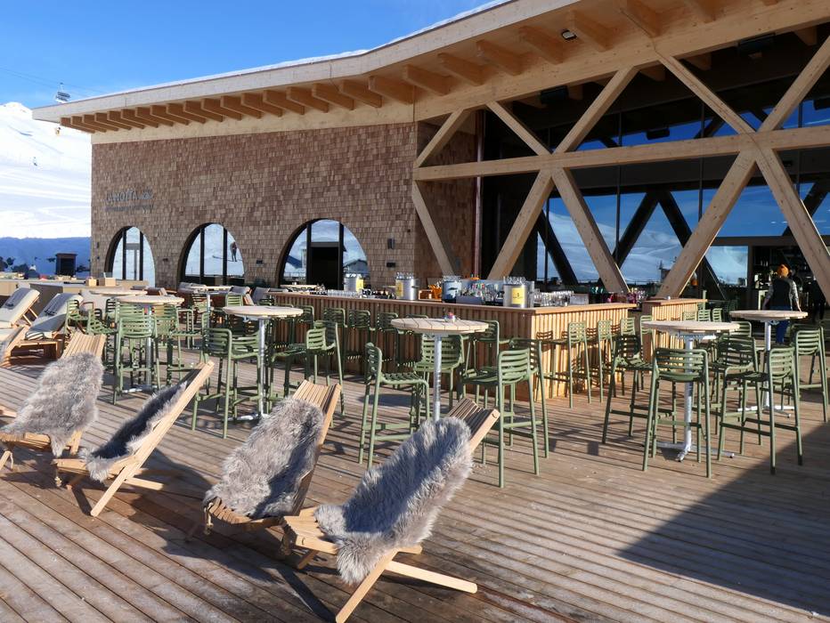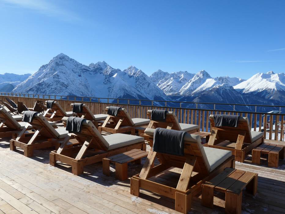 Au bar du restaurant d'altitude La Motta, vous pouvez terminer la journée en beauté. Dans le lounge ou confortablement installé sur les chaises longues, vous profitez pleinement du moment.