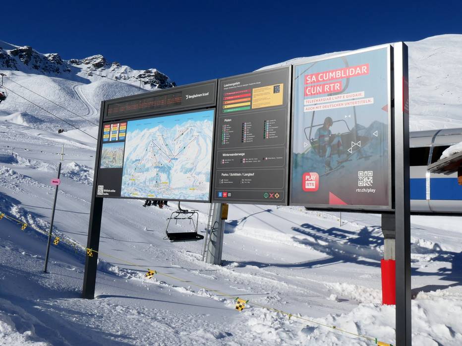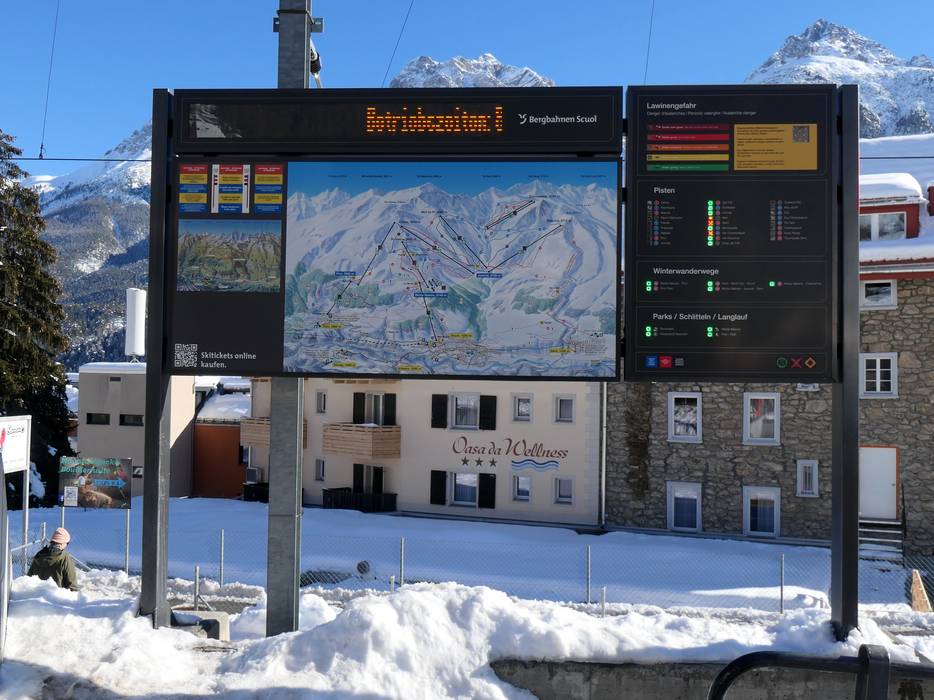 Indications de directions (plans, panneaux informatifs, signalisation) et sécurité sur le domaine skiable Scuol – Motta Naluns