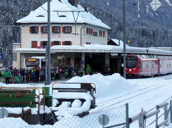 Gare de Scuol (Chemins de fer rhétiques) : accès direct et de plain-pied de la gare à la station de départ de la télécabine - Réseau de navettes développé