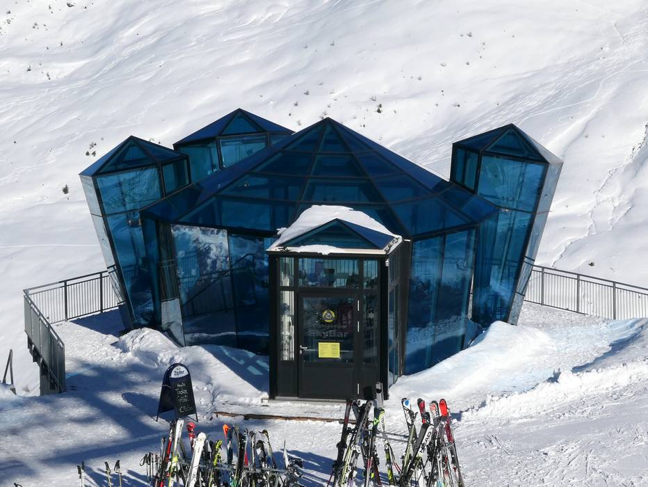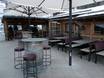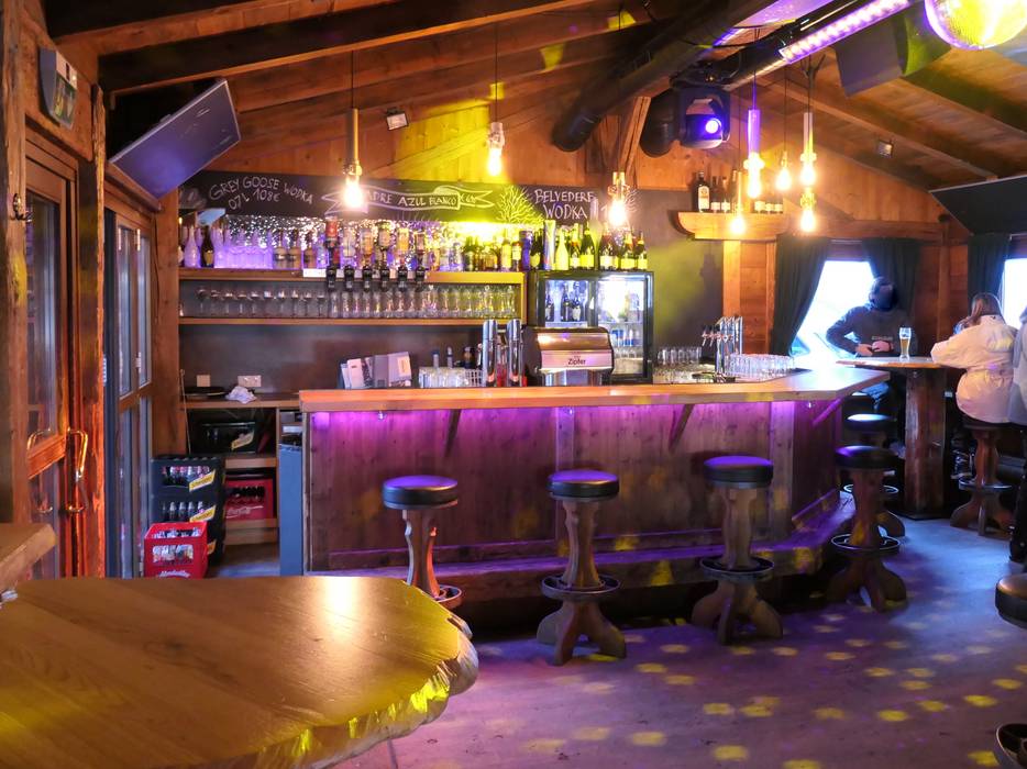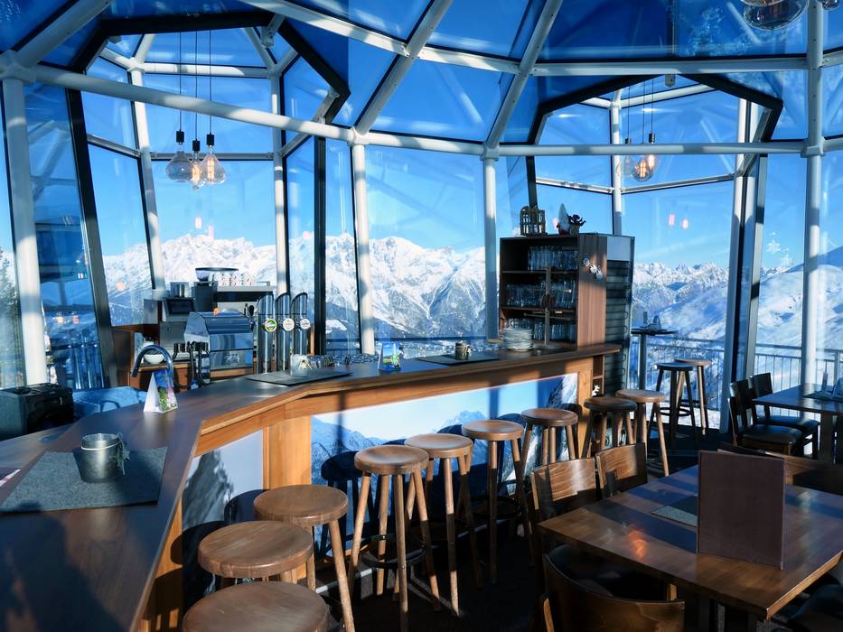 Le bar en bois sur la terrasse ensoleillée du restaurant panoramique est parfait pour prendre un verre entre deux descentes.