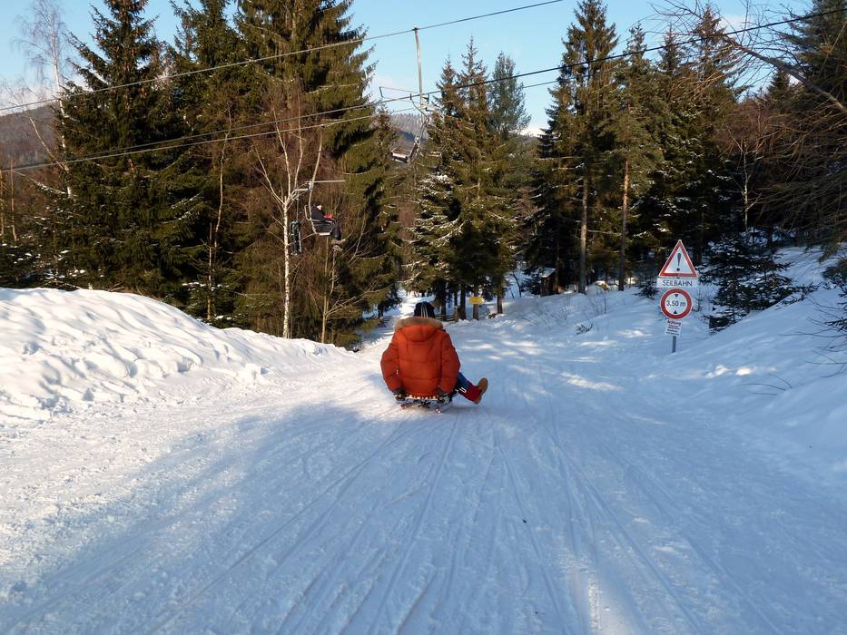 La piste de luge d'hiver de 600 m commence à la station intermédiaire du télésiège. Grâce à un enneigement doux et régulier, l'enneigement est garanti. Les luges peuvent être louées à la station de vallée et l'ascension se fait en télésiège. Une pause peut être faite à la Bergmann-Schänke pour profiter de la vue magnifique. Un plaisir pour toute la famille.
