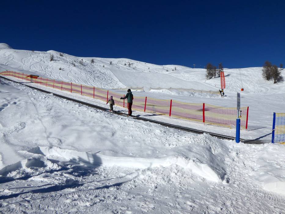 À la station supérieure de la télécabine, il y a un espace d'entraînement délimité et en accès libre avec un tapis roulant. Le tapis roulant de l'école de ski ne peut être utilisé qu'avec des cours de l'école de ski. Au-dessus de la station supérieure se trouvent des pistes faciles et larges, accessibles par un télésiège et un téléski. La descente vers la vallée est facile jusqu'à la station intermédiaire, puis de difficulté moyenne.