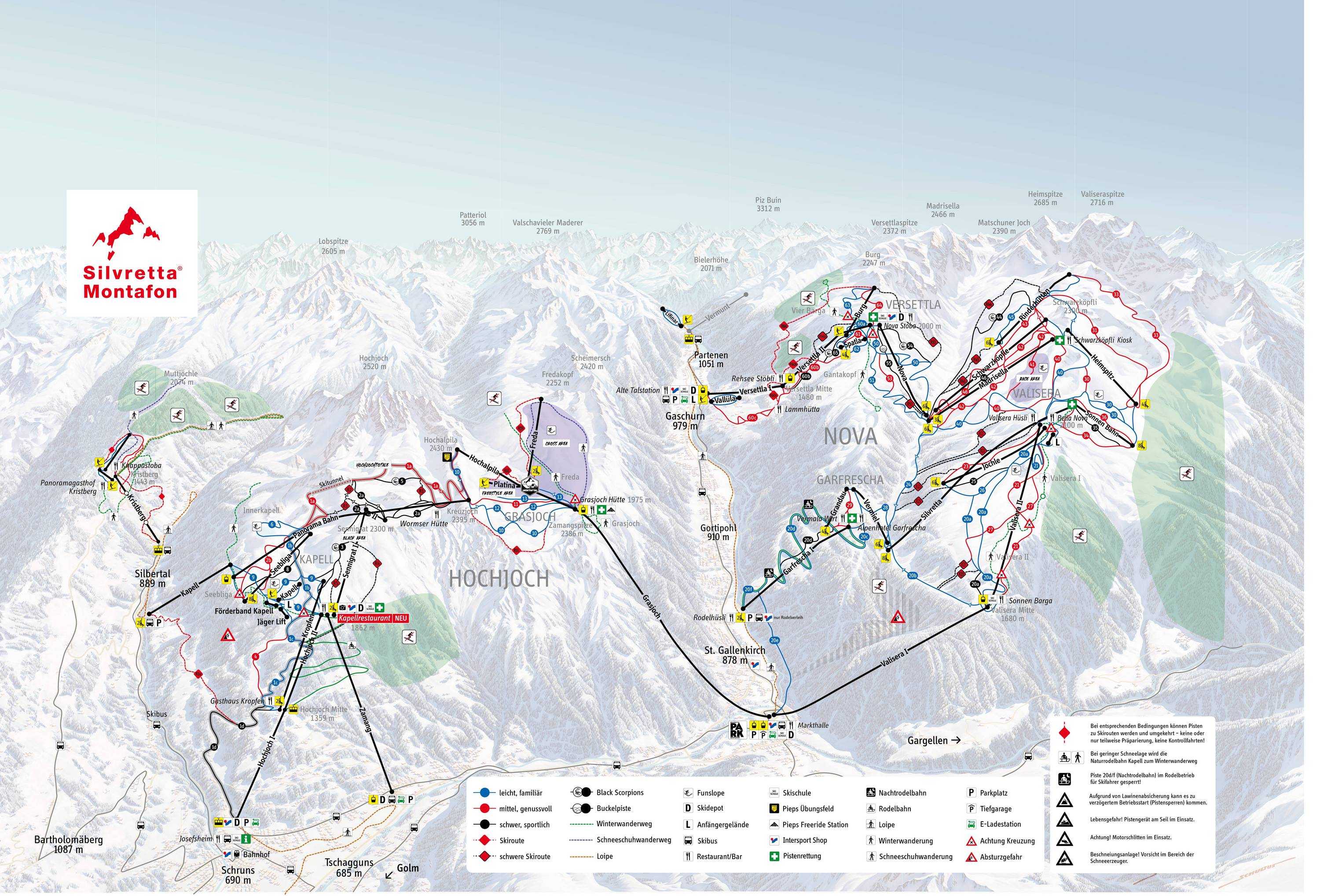 Le plan des pistes représente très bien l'ensemble de la Silvretta Montafon. Les remontées mécaniques, les pistes et toutes les informations importantes y sont indiquées. Au verso, vous trouverez des informations sur les événements hebdomadaires et les manifestations spéciales. De plus, il existe un plan pliant supplémentaire pour les experts et les freeriders. Tous les domaines freeride et les pistes difficiles (Skorpione) y sont indiqués.