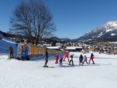 Sur plus de 7 000 m² de terrain sécurisé au Brandstadl, de nombreuses activités sont proposées pour faire de l'apprentissage du ski une véritable aventure pour les enfants. Un tapis roulant extra-large garantit également un apprentissage optimal, avec l'aide des "Helping Hands" des accompagnateurs. L'école de ski pour enfants Scheffau am Wilden Kaiser gère le Kinderland.