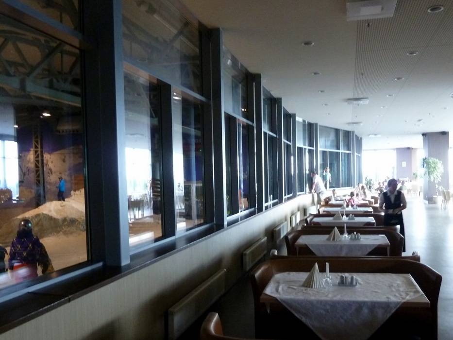 La halle de ski Snow Arena propose plusieurs possibilités de restauration. Juste à l'entrée se trouve un grand restaurant en libre-service. Depuis le parking, un ascenseur mène au restaurant exclusif "Aero Gallery". Le Bo-Bar et un café dans le hall d'entrée complètent l'offre.