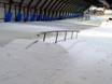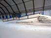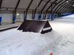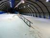 Dans presque toute la halle de ski, on trouve tout ce dont le cœur désire : des rails, des sauts, jusqu’au coussin d’air Bag-Jump. Tous ces éléments sont facilement accessibles par téléski à assiette ou tapis roulant.