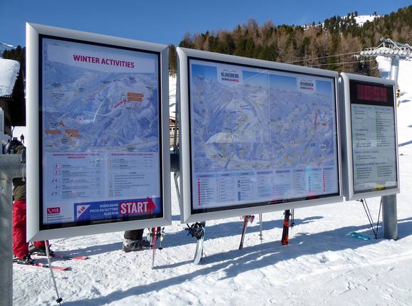 La signalisation sur les pistes est très bonne. Des panneaux sont installés aux intersections et des informations numériques sont disponibles à plusieurs départs de remontées mécaniques. À la station de la vallée et à la station supérieure Speikboden, on trouve des informations numériques sur l’état actuel des installations. Dans la télécabine Speikboden, il y a même des plans des pistes à emporter.