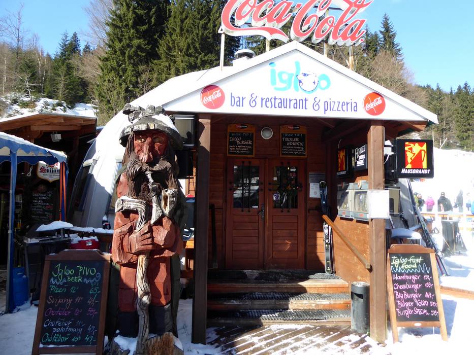 Le bar Igloo propose des spécialités tchèques et des pizzas maison. Vous pouvez vous attarder dans la salle rustique ou sur la terrasse chauffée. L'après-midi, des spécialités de café et des gâteaux vous attendent.