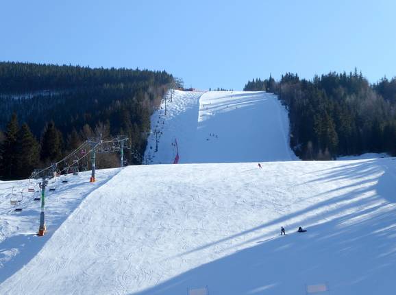 Au Medvědín et à Pláň, une descente corsée attend les skieurs. À Stoh, une autre piste difficile est proposée. Il est strictement interdit de quitter les pistes pour faire du freeride, car le domaine skiable de Spindlermühle se situe dans le parc national de Krkonoše.