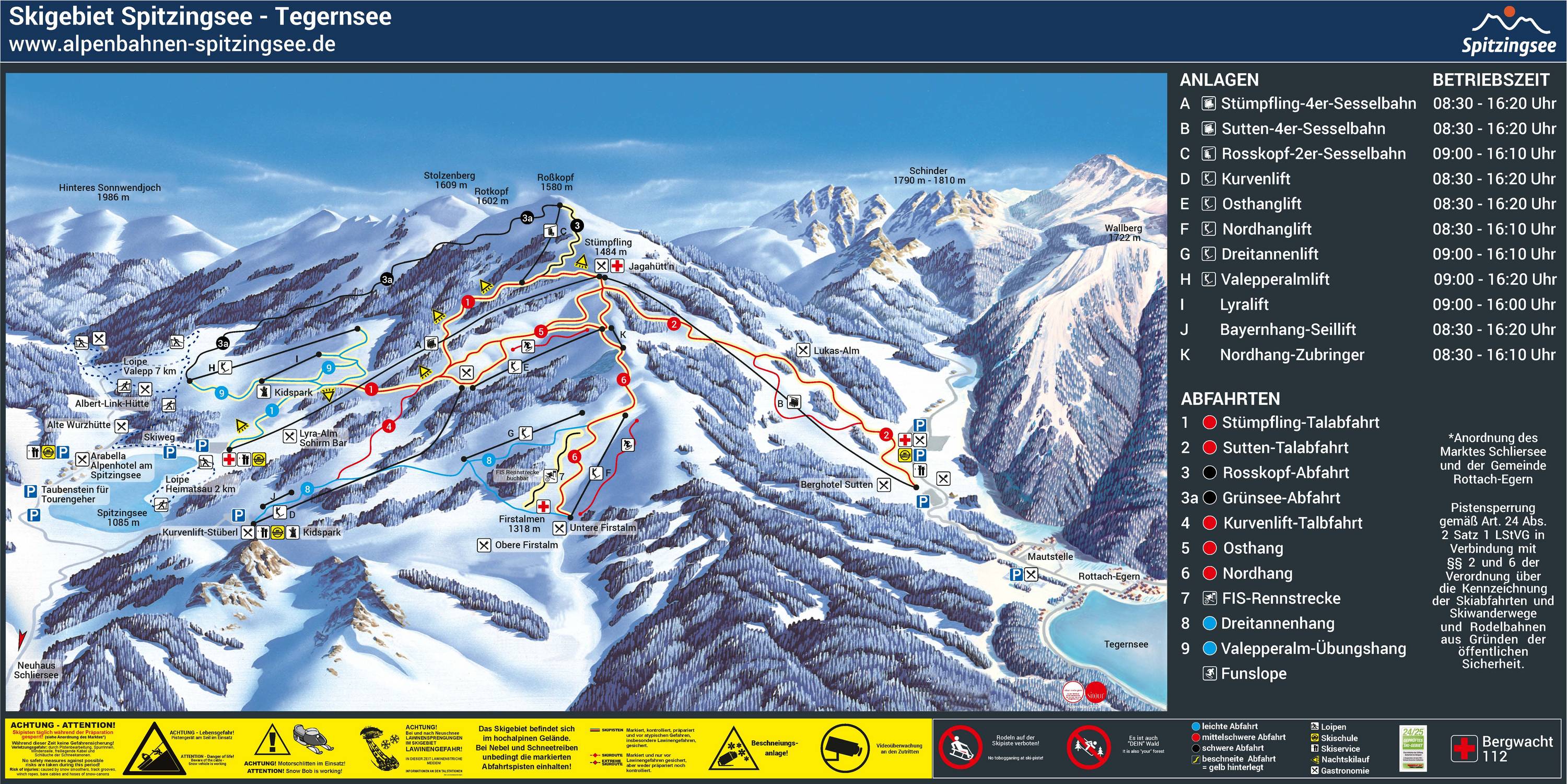 Le plan des pistes du domaine skiable Spitzingsee-Tegernsee représente très bien l’ensemble de la station de sports d’hiver. Tous les remontées mécaniques et les pistes y sont indiqués. Vous y trouverez également tous les points de restauration ainsi que des informations complémentaires. Au verso figurent les tarifs des forfaits de ski, les offres spéciales et les promotions.