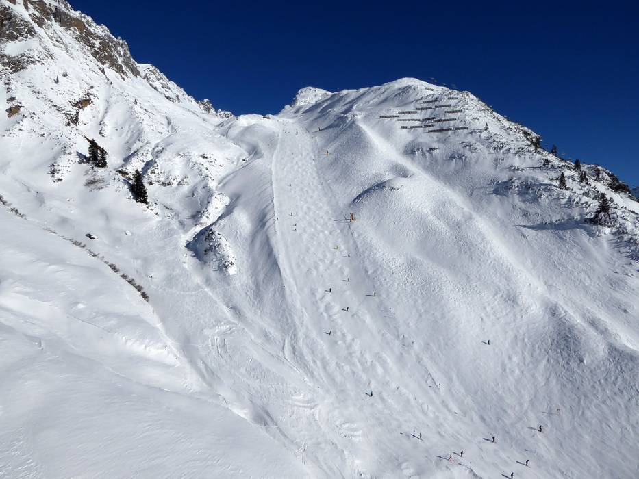 Avec une pente maximale de 80 %, la piste Lange Zug présente dans sa partie supérieure, sur 391 m de longueur et 199 m de dénivelé, une pente moyenne spectaculaire de 78 %. - Fang (St. Anton) · Longueur 2 km · Dénivelé 546 m