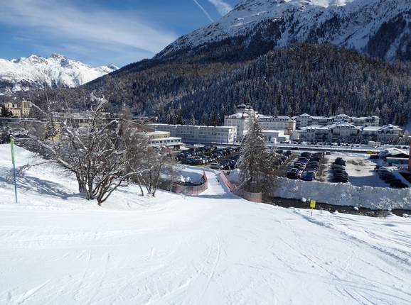 L'accès à St. Moritz est possible par divers cols de montagne ou par le tunnel de la Vereina (avec chargement automobile). Depuis Zurich, St. Moritz est accessible en 2,5 heures, depuis Munich en 4 heures, depuis Milan en un peu moins de 3 heures et depuis Innsbruck en 2,5 heures. Les autoroutes les plus proches sont relativement éloignées du domaine skiable. À Celerina et St. Moritz Bad, il est possible de se garer directement aux remontées mécaniques. À St. Moritz même, il existe deux parkings couverts. Depuis le parking Serletta (près de la gare), il faut traverser la ville à pied pour rejoindre le funiculaire Chantarella. Le parking Quadrellas, qui compte 200 places, se trouve à seulement 80 mètres environ du funiculaire Chantarella. Un autre accès est disponible à Suvretta. Les places de parking sont généralement payantes. Si les conditions d’enneigement rendent les routes plus difficiles, il est possible de rejoindre l’Engadine depuis Klosters/Selfranga dans le Prättigau grâce au transport de voitures par le tunnel de la Vereina. Ceux qui en ont les moyens peuvent rejoindre la région Engadin St. Moritz en jet privé et atterrir à l’aéroport privé tout proche de Samedan.