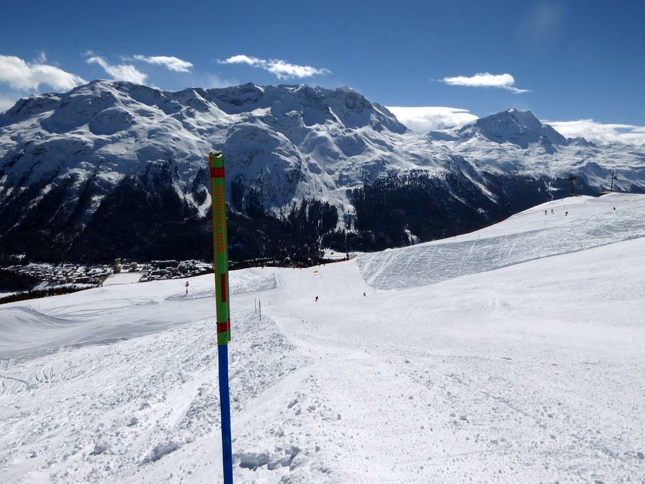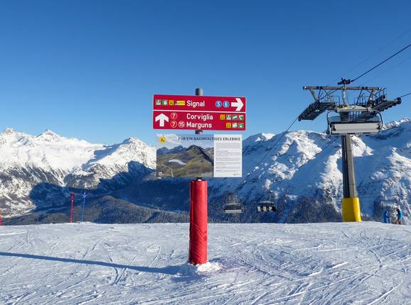 Indications de directions (plans, panneaux informatifs, signalisation) et sécurité sur le domaine skiable St. Moritz – Corviglia