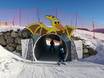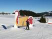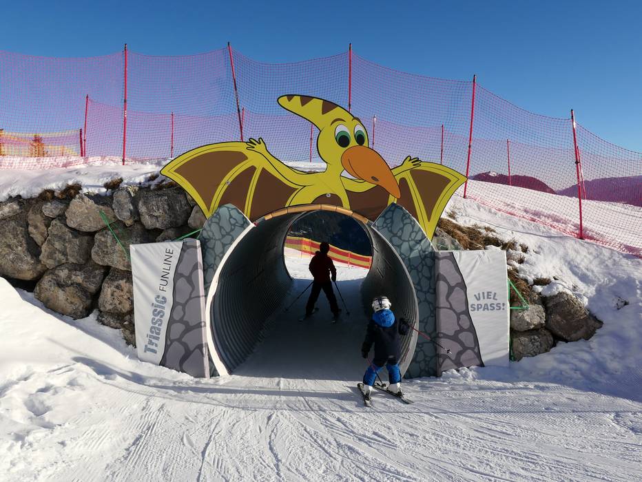 La Funline avec des dinosaures se trouve juste à côté du snowpark. La « piste ludique » se compose de vagues, de virages relevés, d’un escargot de neige avec tunnel et d’autres éléments de neige comme de petits sauts, des modules de slide et un slalom. Plaisir garanti pour tous !