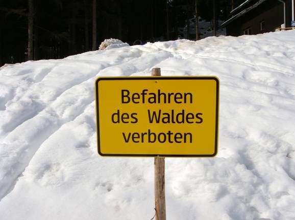 Des panneaux indiquent qu'il est interdit de traverser la forêt et qu'elle doit être protégée.