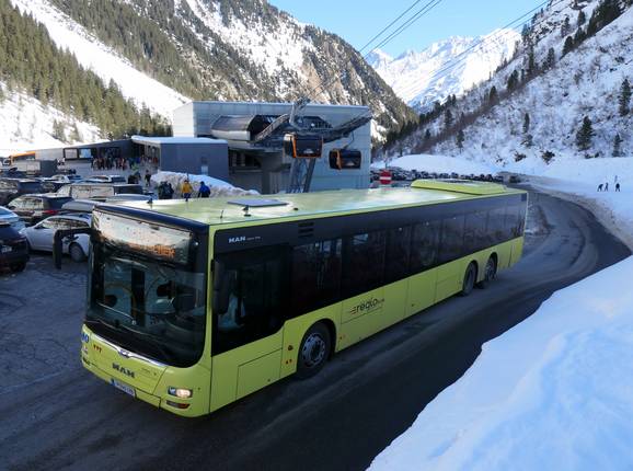 Depuis la gare centrale d'Innsbruck, un bus de ligne circule directement jusqu'à la station inférieure Mutterberg au glacier de Stubai. - Réseau de navettes développé