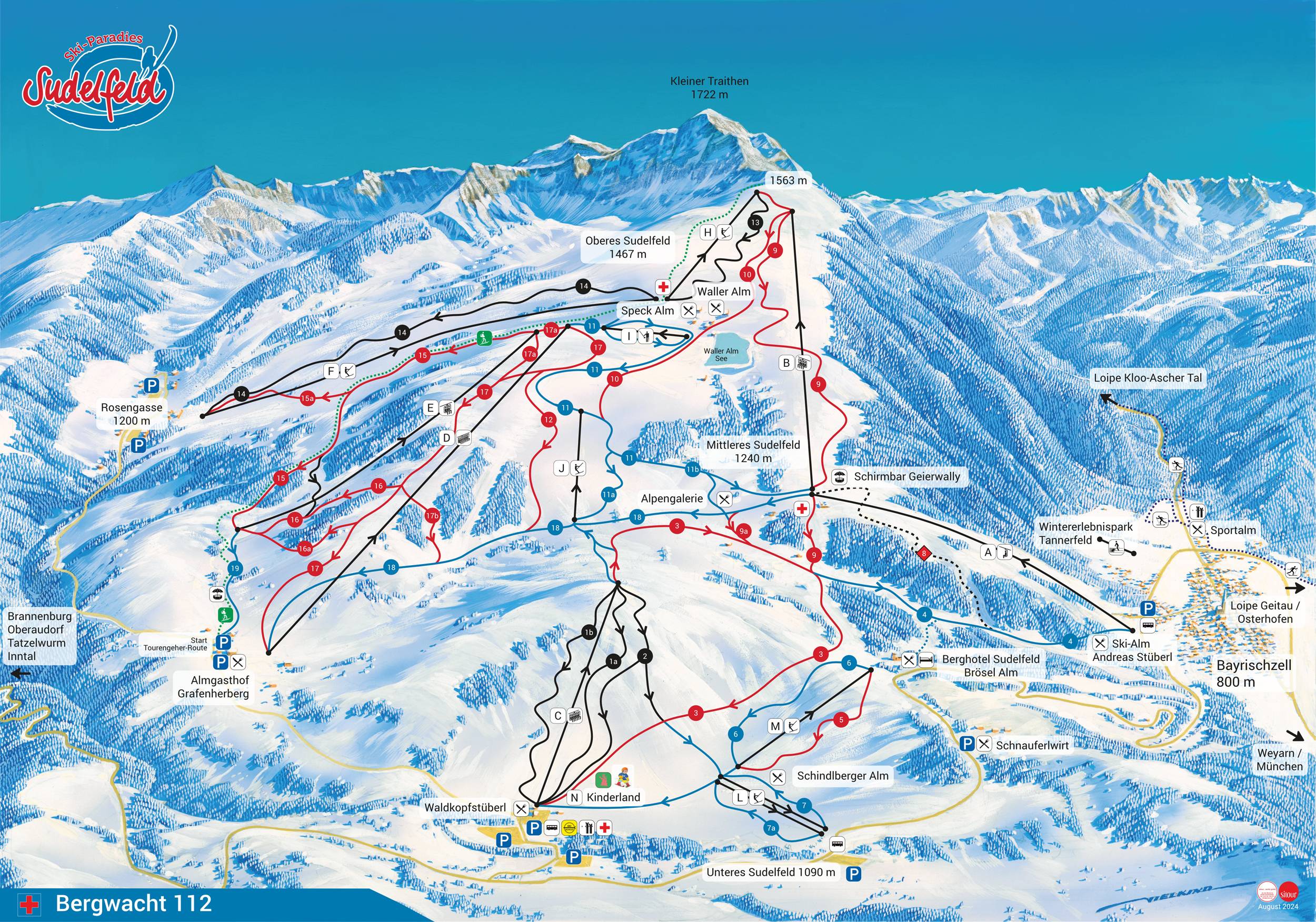 Le plan des pistes du domaine skiable de Sudelfeld représente très bien l’ensemble de la station de sports d’hiver. Tous les remontées mécaniques et les pistes y sont indiqués. On y trouve également tous les points de restauration ainsi que des informations complémentaires. Au verso, les tarifs des forfaits de ski, les offres spéciales et les promotions sont indiqués.